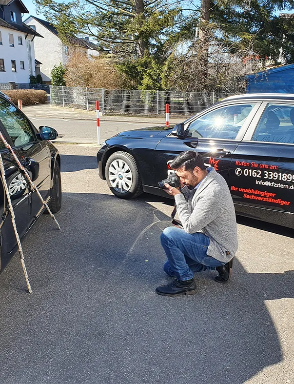 Unser Gutachter dokumentiert den gesamten Schaden mit Fotos, prüft auch verdeckte Beschädigungen und nimmt die relevanten Fahrzeugdaten auf.